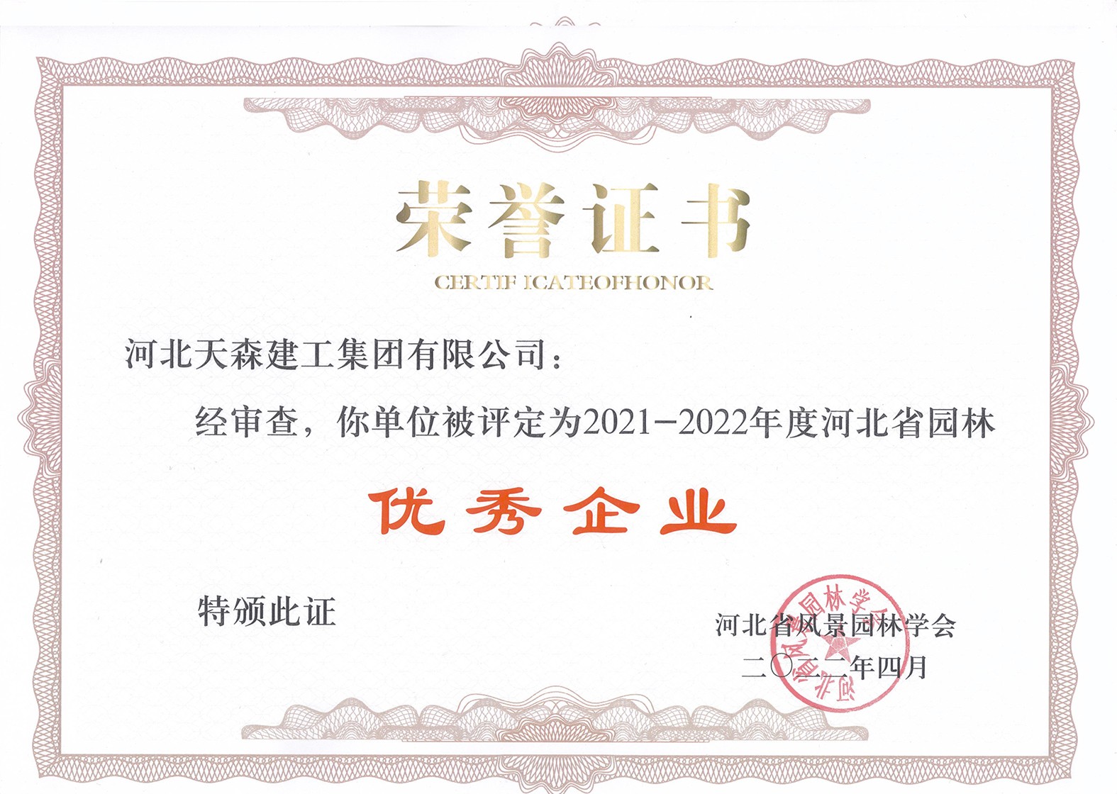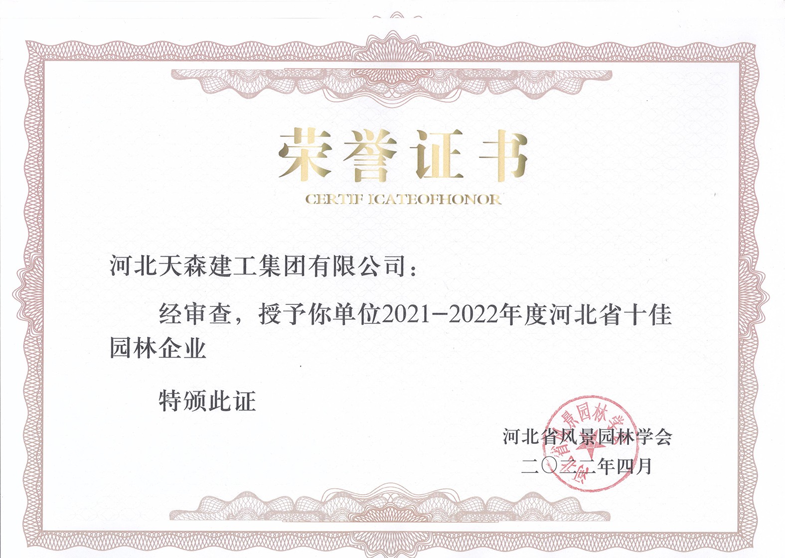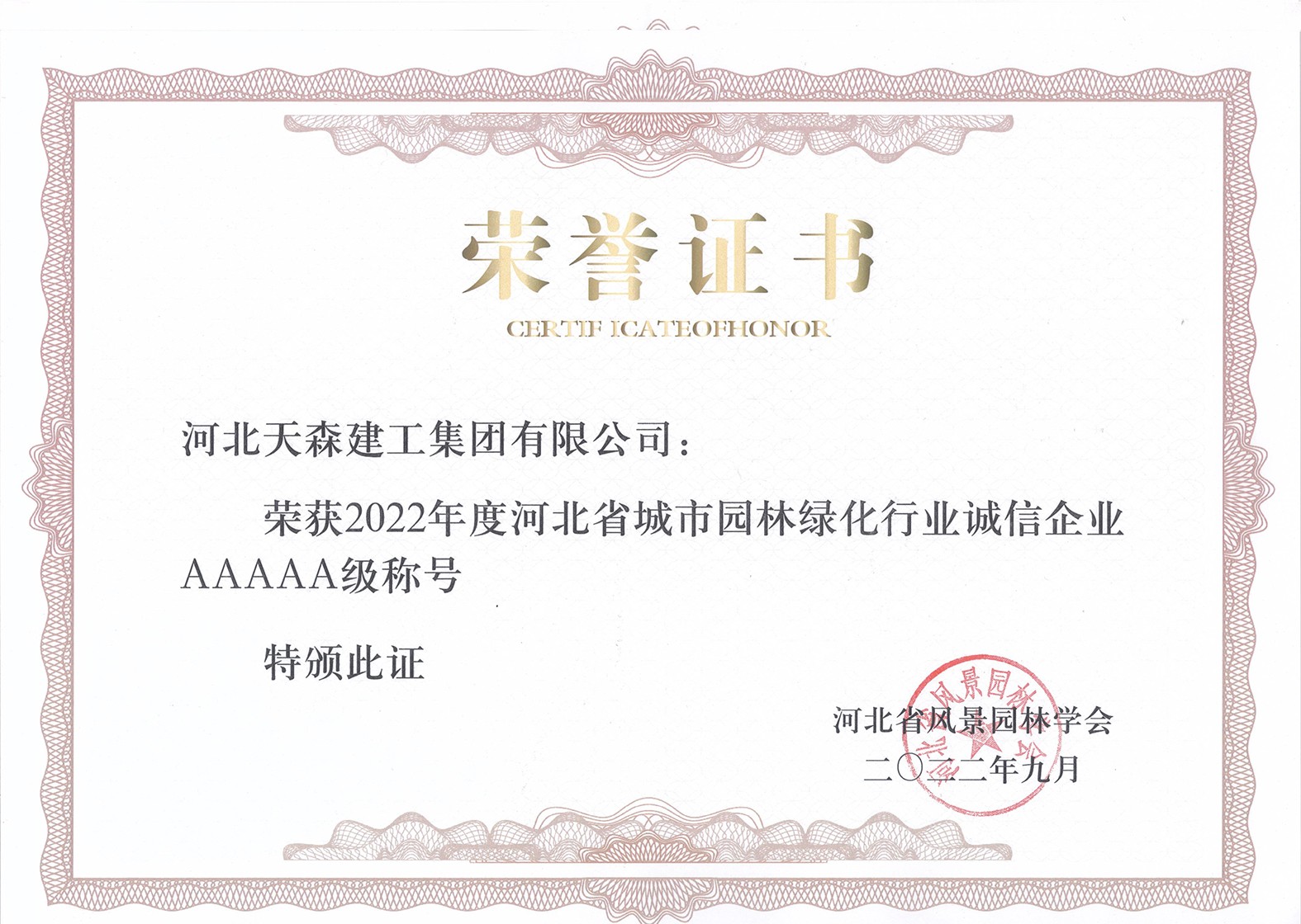 此外公司還榮獲2022年度河北省城市園林綠化行業(yè)誠(chéng)信企業(yè)AAAAA級(jí)稱號(hào)、集團(tuán)公司被授予2021-2022年度河北省十佳園林企業(yè)、集團(tuán)公司被評(píng)定為2021-2022年度河北省園林優(yōu)秀企業(yè)。